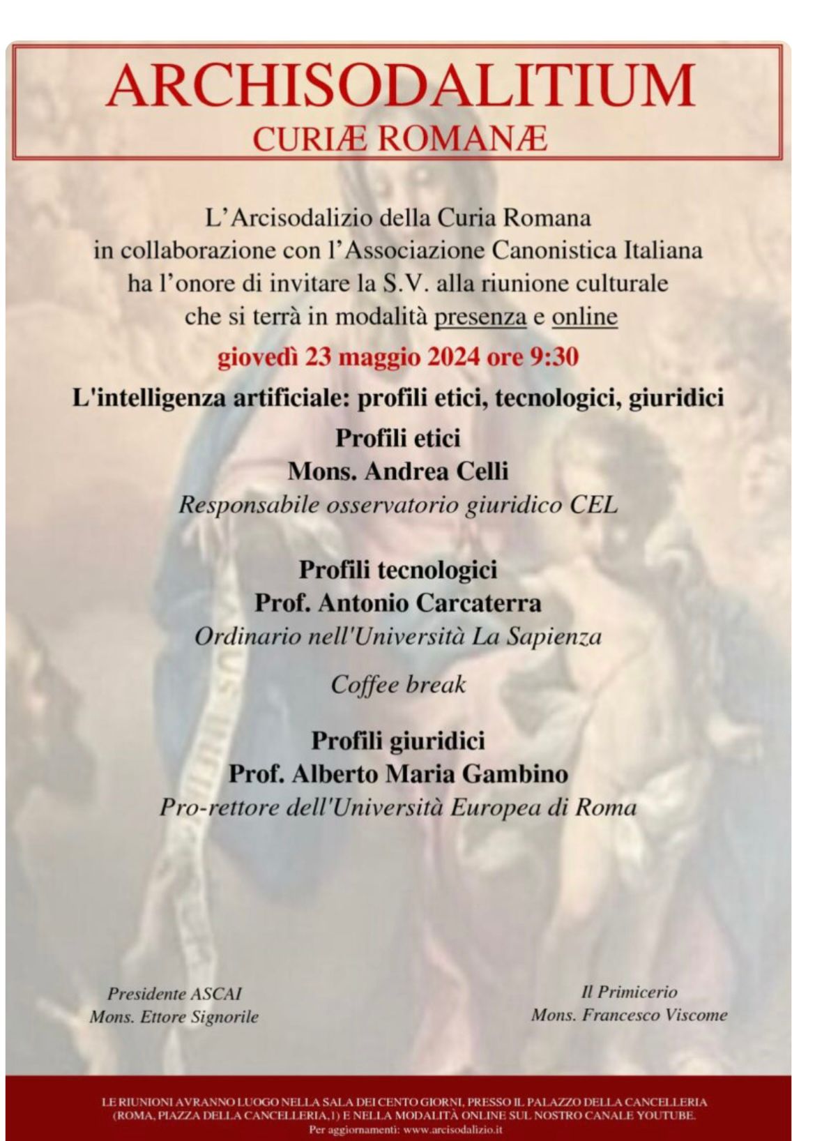 L’Arcisodalizio della Curia Romana, in collaborazione con l’Associazione Canonistica Italiana, terrà un incontro culturale dal titolo: L’intelligenza artificiale: profili etici, tecnologici, giuridici.
