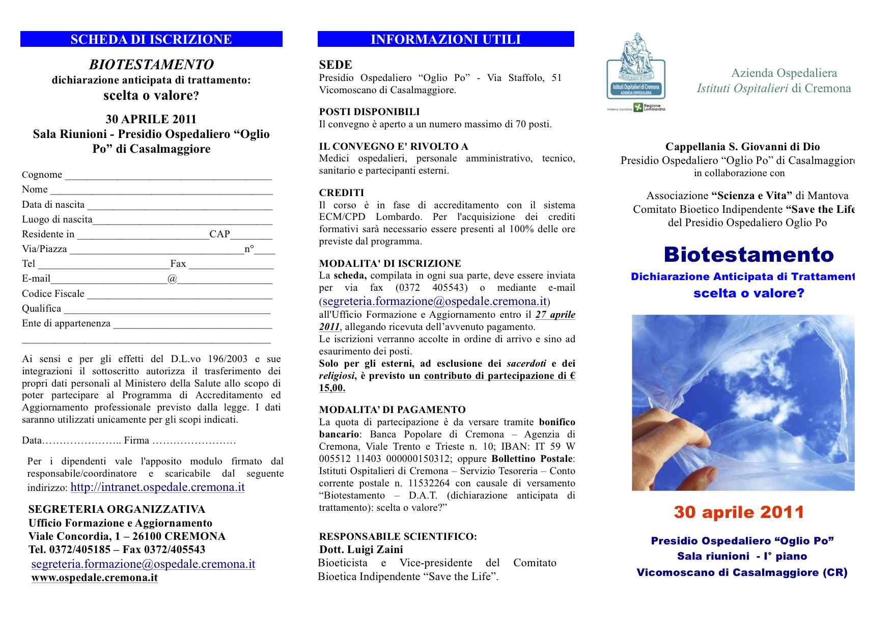 In queste ultime settimane, il Parlamento Italiano all’interno delle varie commissioni, sta discutendo la legge sul testamento biologico o Dat (Dichiarazioni anticipate di trattamento) in cui viene data ad ogni cittadino la possibilità di esprimere per iscritto la volontà in merito alle terapie che intende o non intende accettare nel caso dovesse trovarsi in stato di incoscienza. Il dibattito è molto acceso vista la crucialità dell’argomento e numerosi sono gli articoli che quotidianamente vengono pubblicati sulle varie testate giornalistiche. La legge che è in discussione ha un titolo molto ampio in quanto al suo interno si collocano articoli che riguardano: l’eutanasia, il suicidio assistito, le cure palliative, il fine vita, gli stati vegetativi, l’alleanza terapeutica, nonché il consenso informato. Diventa necessario per tutti gli operatori, sanitari e non, comprendere quali sono i punti favorevoli al sostentamento della vita, alla salute del cittadino nonché di vietare sia l’eutanasia che il suicidio assistito in modo da confermare l’alleanza terapeutica. Le varie questioni trovano negli operatori un motivo di approfondimento in quanto essi quotidianamente toccano la fragilità della vita. Allo stesso tempo anche il personale volontario, che affluisce alla struttura ospedaliera, deve conoscere la misura di una nuova umanità che sa confrontarsi con il significato della sofferenza e del sofferente. Cioè che sicuramente oggi è richiesto al mondo sanitario è quello di valorizzare le buone pratiche mediche ed assistenziali che permettano di guardare con fiducia al gesto di affidarsi ad altri quando non saremo più in grado di essere noi il punto di riferimento per noi stessi e per coloro che ci amano.