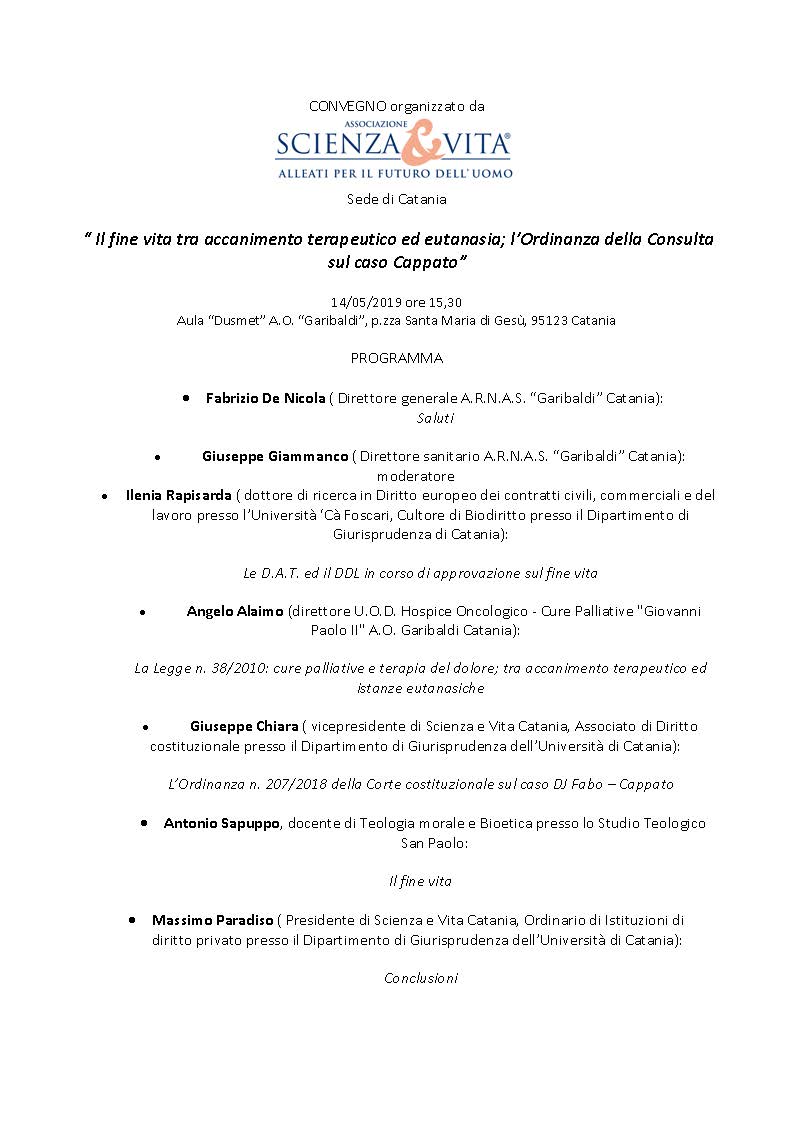 L’Associazione Scienza & Vita Catania ha organizzata il giorno martedì 14 maggio a Catania, con inizio dalle ore 15:30, presso l’Aula “Dusmet” A.O. “Garibaldi”, piazza Santa Maria di Gesù il Convegno dal titolo “
