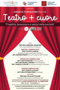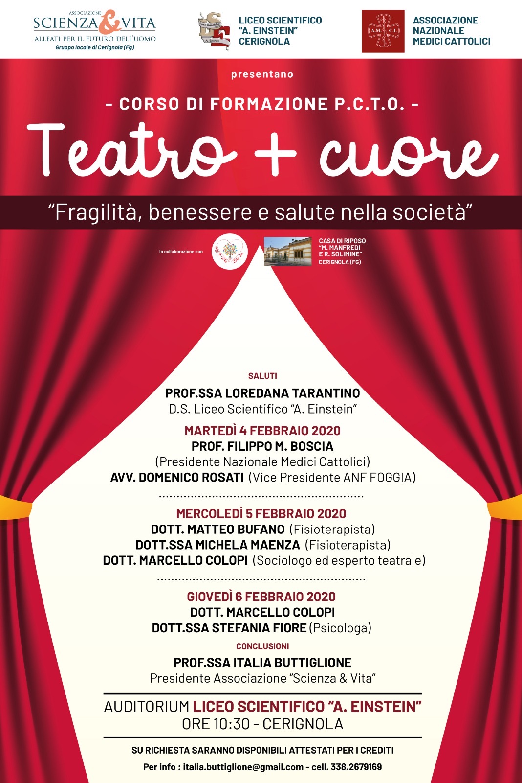 Scienza & Vita Cerignola, AMCI ed il Liceo Scientifico “A. Einstein” di Cerignola presentano il Corso di Formazione P.C.T.O. Teatro + Cuore dal titolo “Fragilità, benessere e salute nella società” che si terrà nei giorni 4, 5 e 6 febbraio prossimi, dalle ore 10:30, presso l’Auditorium del Liceo Scientifico “A. Einstein” di Cerignola.