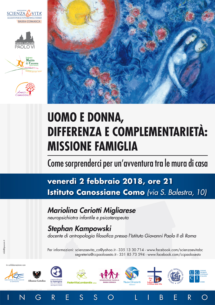 Venerdì 2 febbraio, dalle ore 21,00 presso l’Istituto Canossiane di Como, in Via S. Balestra n. 10, si svolgerà, organizzato da Scienza & Vita Bassa Comasca, dal Centro Culturale Paolo VI, …, l’evento “Uomo e Donna, differenza e complementarietà: Missione Famiglia. Come sorprenderci per un’avventura tra le mura di casa”.