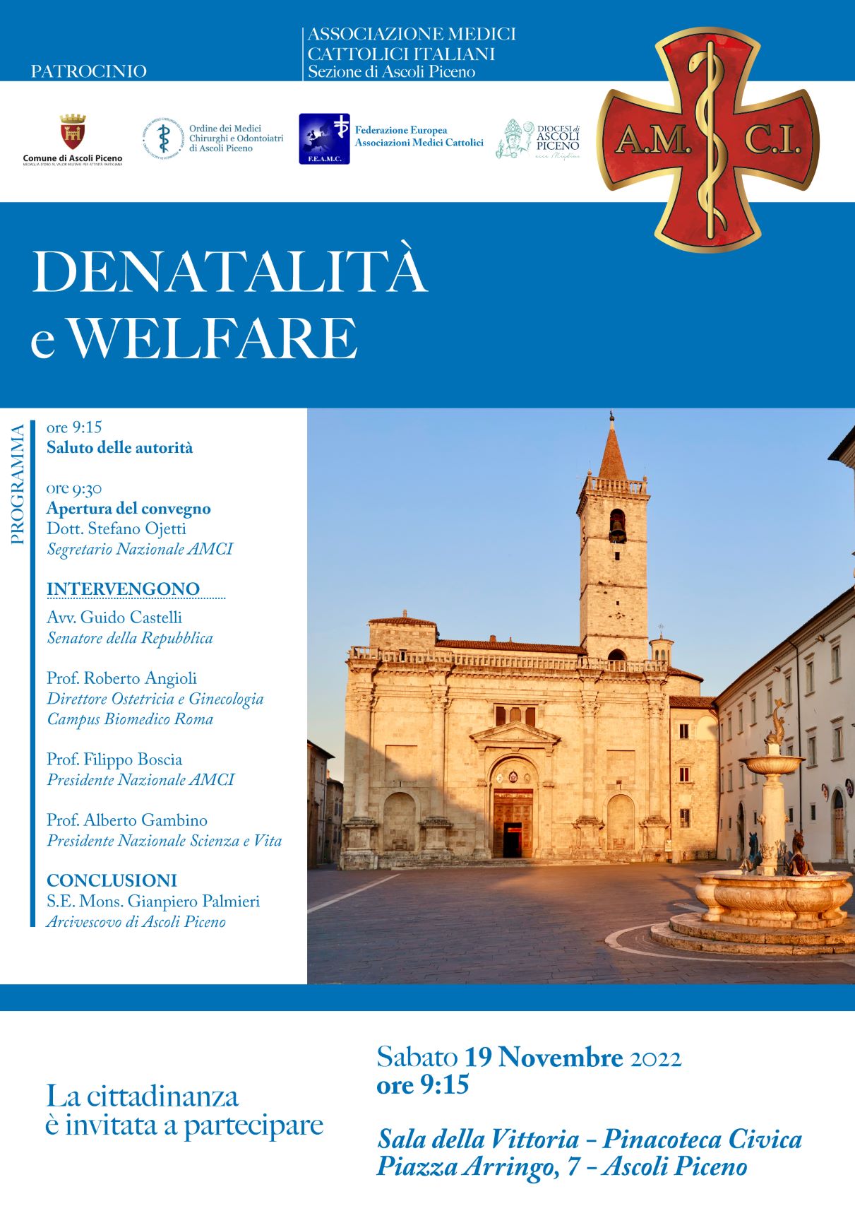 Il prossimo 19 novembre 2022, alle ore 9,15, si terrà il convegno “Denatalità e Welfare”, organizzato dal Comune di Ascoli Piceno, la Diocesi di Ascoli Piceno, AMCI, FEAMC, OMCeO di Ascoli Piceno. Tra i relatori il nostro presidente Alberto Gambino.