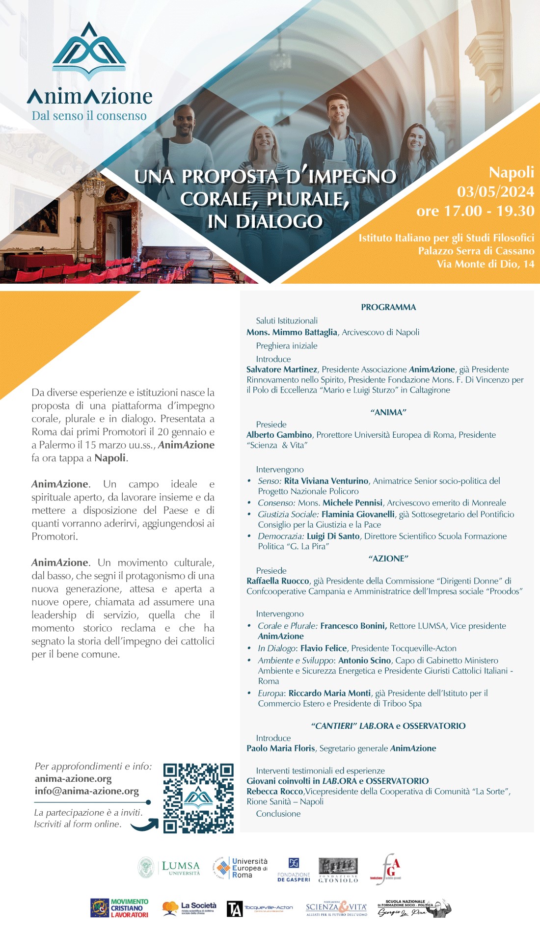 “Una proposta di impegno corale, plurale, in dialogo”. È il titolo dell’evento promosso da “AnimAzione. Dal senso il consenso” promosso il 3 maggio, dalle 17 alle 19.30, a Napoli, presso l’Istituto italiano per gli studi filosofici (Palazzo Serra di Cassano, in via Monte di Dio, 14).L’appuntamento partenopeo sarà aperto dai saluti istituzionali di mons. Mimmo Battaglia, arcivescovo di Napoli, e dall’introduzione di Salvatore Martinez, presidente di “AnimAzione”.
