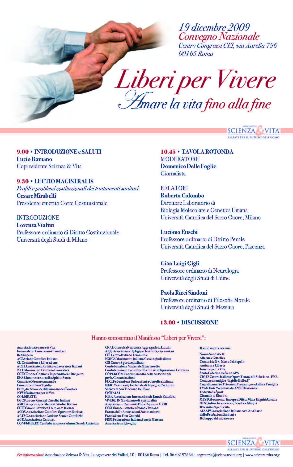 Relatori Prof. Lucio Romano, Copresidente Scienza & Vita; Prof. Cesare Mirabelli, Presidente emerito Corte Costituzionale; Prof.ssa Lorenza Violini, Ordinario di Diritto Costituzionale Università degli Studi di Milano; Dott. Domenico Delle Foglie, giornalista; Prof. Roberto Colombo, Direttore Laboratorio di Biologia molecolare e genetica umana Università Cattolica del Sacro Cuore di Milano; Prof. Luciano Eusebi, Ordinario Diritto penale Università Cattolica del Sacro Cuore di Piacenza; Prof. Gianluigi Gigli, Ordinario di Neurologia Università degli Studi di Udine; Prof.ssa Paola Ricci Sindoni, Università degli Studi di Messina