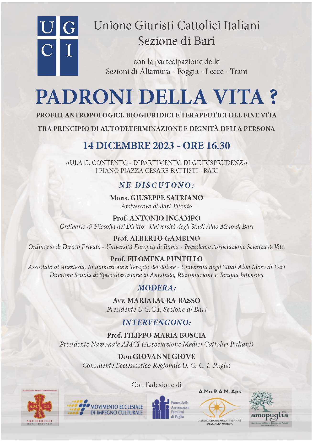 NE DISCUTONO: Mons. GIUSEPPE SATRIANO Arcivescovo di Bari-Bitonto; Prof. ANTONIO INCAMPO Ordinario di Filosofia del Diritto, Università degli Studi Aldo Moro di Bari; Prof. ALBERTO GAMBINO Ordinario di Diritto Privato – Università Europea di Roma – Presidente Associazione Scienza & Vita; Prof.ssa FILOMENA PUNTILLO Associato di Anestesia, Rianimazione e Terapia del dolore – Università degli Studi Aldo Moro di Bari, Direttore Scuola di Specializzazione in Anestesia, Rianimazione e Terapia Intensiva