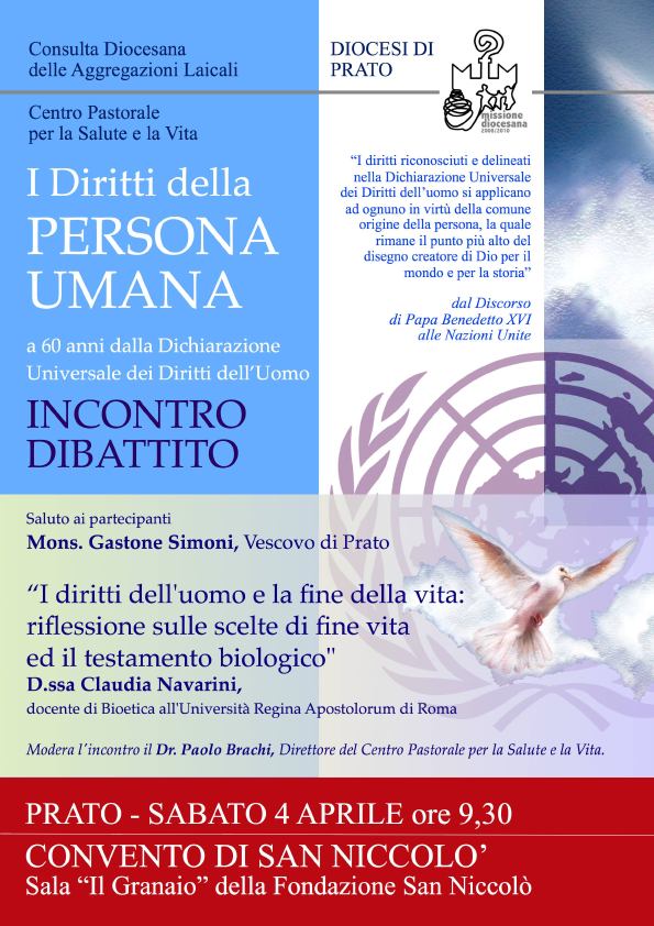 Relatori Mons. Gastone Simoni (Vescovo di Prato), D.ssa Claudia Navarini (Docente di Bioetica all'Università Regina Apostolorum di Roma)