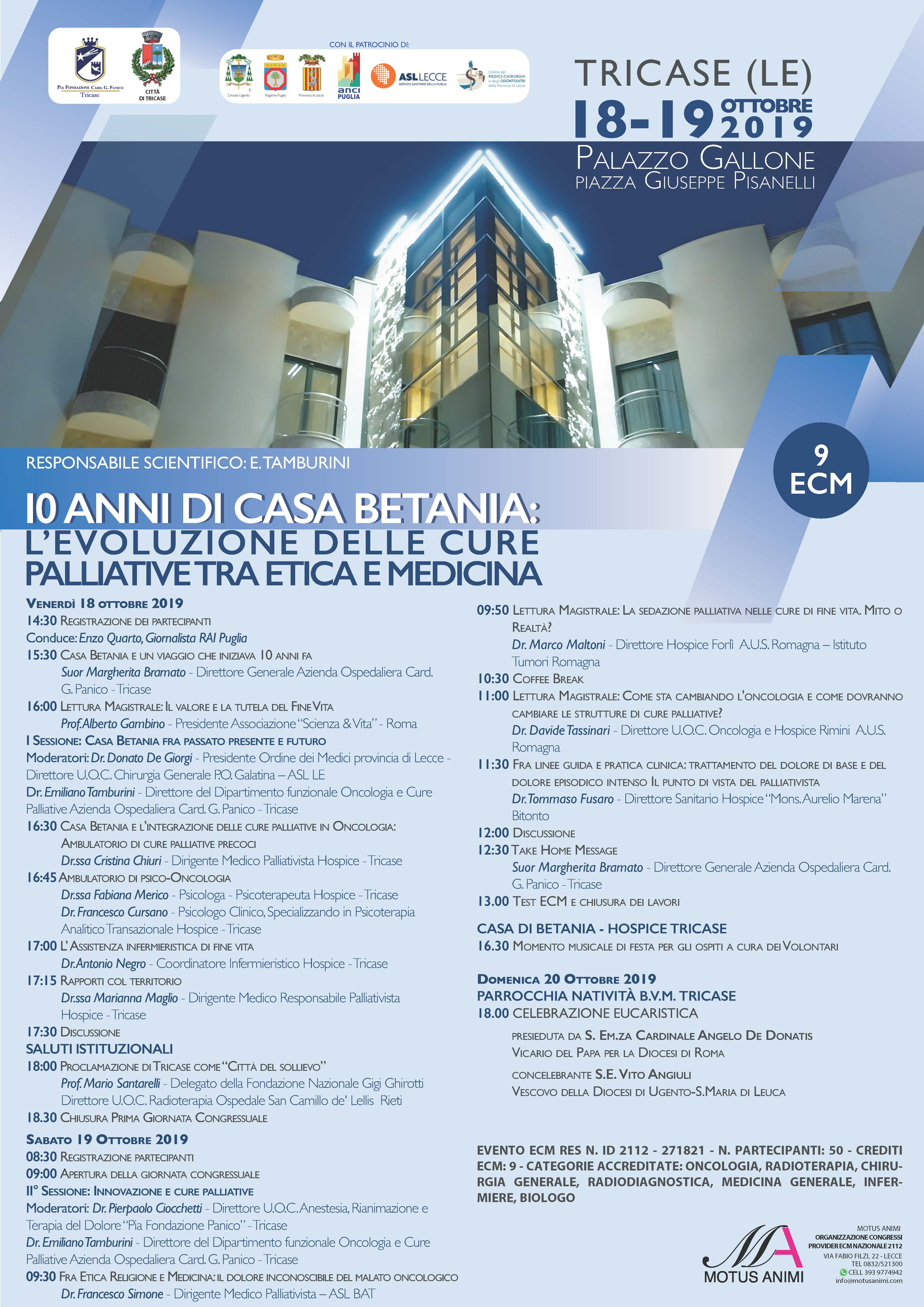 Il prossimo 18 e 19 ottobre, in occasione dei 10 anni dell’Hospice Casa Betania, si parlerà di Evoluzione delle cure palliative, tra etica e medicina. Il convegno si svolgerà presso PALAZZO GALLIONI, in piazza Giuseppe Pisanelli a Tricase (LE). La partecipazione all’incontro permette l’acquisizione di n.9 crediti ECM. Scarica il programma