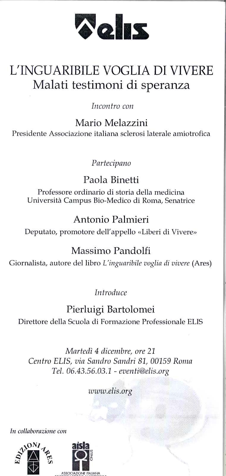 Incontro con Mario Melazzini, presidente Associazione Italiana Sclerosi Laterale Amiotrofica. Introduce Pierluigi Bartolomei, Direttore Scuola professionale Elis.