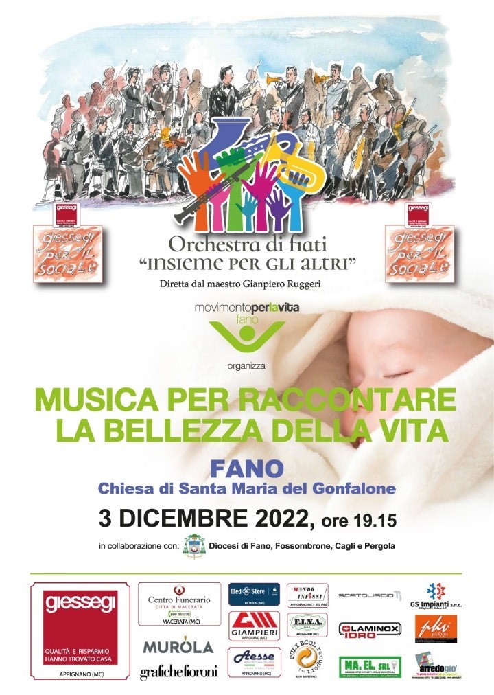 Il Movimento per la Vita di Fano, in collaborazione con la Diocesi, organizza, sabato 3 dicembre alle ore 19.15 nella chiesa di Santa Maria del Gonfalone, “Musica per raccontare la bellezza della vita” con l’Orchestra di fiati “Insieme per gli altri” diretta dal M° Giampiero Ruggeri. Partecipa !