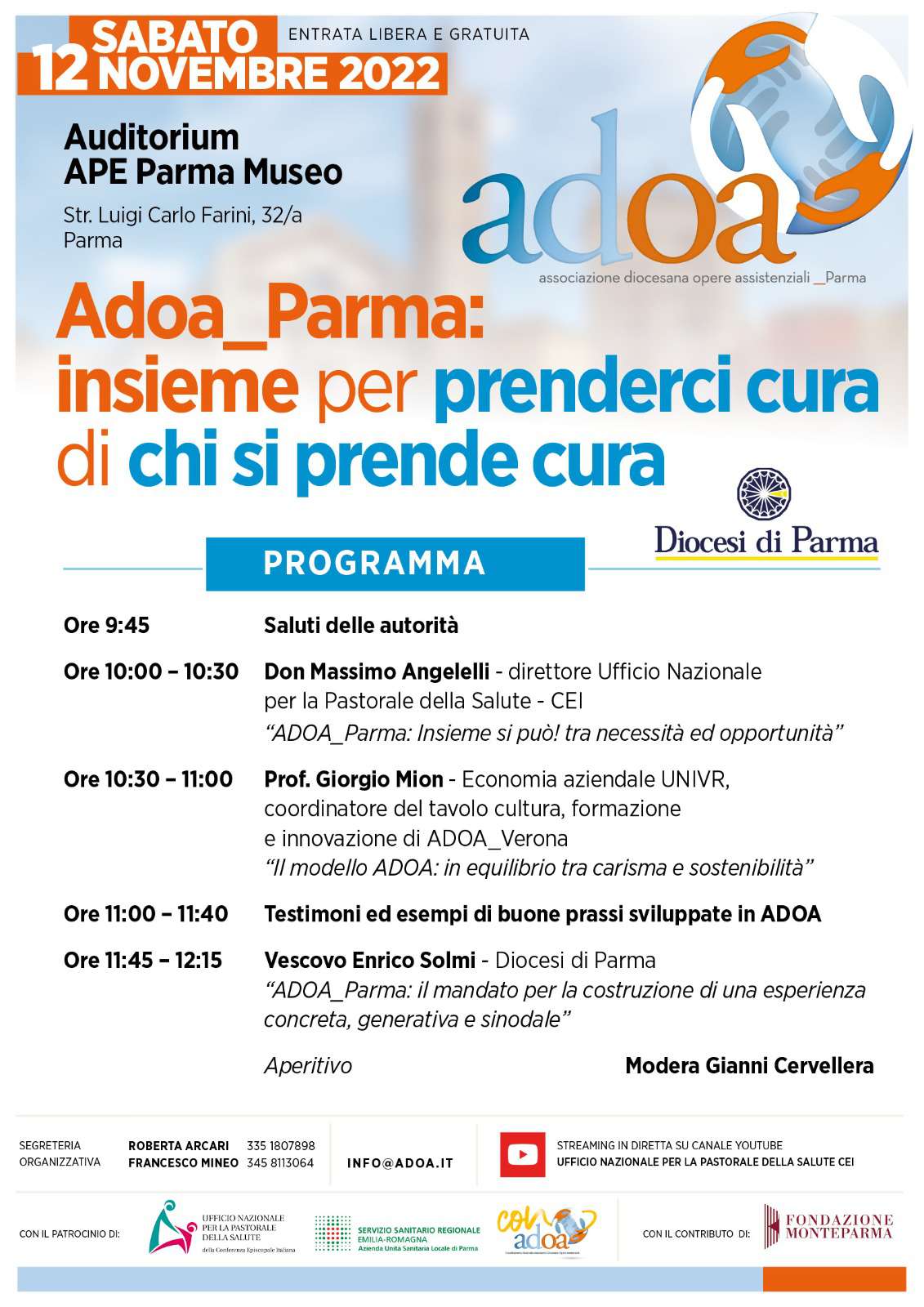 Presso l’Auditorium APE Parma Museo, il prossimo 12 novembre 2022 sarà presentata l’Associazione Diocesana Opere Assistenziali di Parma (Adoa_Parma), in collaborazione con il Comune di Parma e l’Azienda unità sanitaria locale Parma: un’esperienza di sinergia e sinodalità tra opere del territorio diocesano che svolgono il proprio servizio a supporto delle persone più vulnerabili.