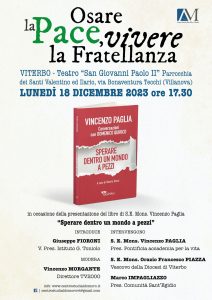 Lunedì 18 dicembre 2023 alle ore 17.30, in occasione dell’incontro Osare la Pace, vivere la Fratellanza, si terrà la presentazione del nuovo libro di Mons. Vincenzo Paglia “Sperare dentro un mondo a pezzi”, presso il Teatro “San Giovanni Paolo II” Parrocchia dei Santi Valentino ed Ilario (Villanova- Viterbo)