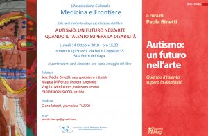 Dopo il successo dei precedenti incontri dedicati al progetto e alla pubblicazione del libro ‘Autismo: un futuro nell’arte. Quando il talento supera la disabilità’ (Edizioni Magi), lunedì 14 ottobre prossimo, con l’Associazione Culturale Medicina e Frontiere, nella Sala Perin del Vaga dell’ISTITUTO LUIGI STURZO (via delle Coppelle 35), dalle ore 15.00, si parlerà di nuovo di Autismo. Invito autismo