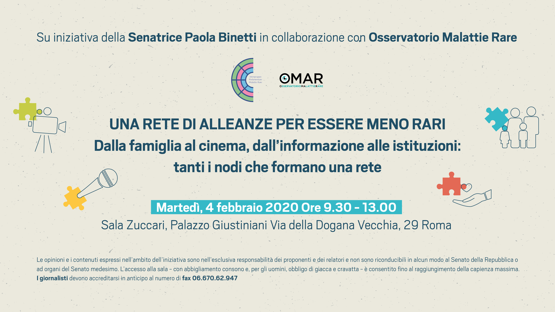 Per accreditarsi inviare mail entro il 2 febbraio 2020 all’indirizzo binetti.stampa@gmail.com oppure accrediti@osservatoriomalattierare.it specificando nell’oggetto convegno “Una Rete di Alleanze per essere Meno Rari”.