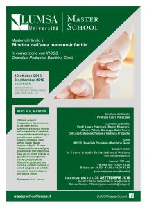 Sono aperte le iscrizioni del master di I livello in Bioetica dell’area materno-infantile organizzato dalla Lumsa, in convenzione con l’Ospedale Pediatrico Bambino Gesù. Il Master consente di qualificare in senso specialistico la propria attività professionale ed è finalizzato all’acquisizione delle specifiche competenze richieste nelle strutture socio-sanitarie dedicate alla cura della madre e del bambino. Il Master fornisce, inoltre, competenze qualificate per attività di consulenza nell’ambito dei Comitati etici per la sperimentazione e la pratica clinica nell’area materno-infantile, ed è indirizzato a infermieri, medici, operatori sanitari, terapisti della riabilitazione, assistenti sociali, educatori professionali, psicologi, filosofi, teologi e giuristi.