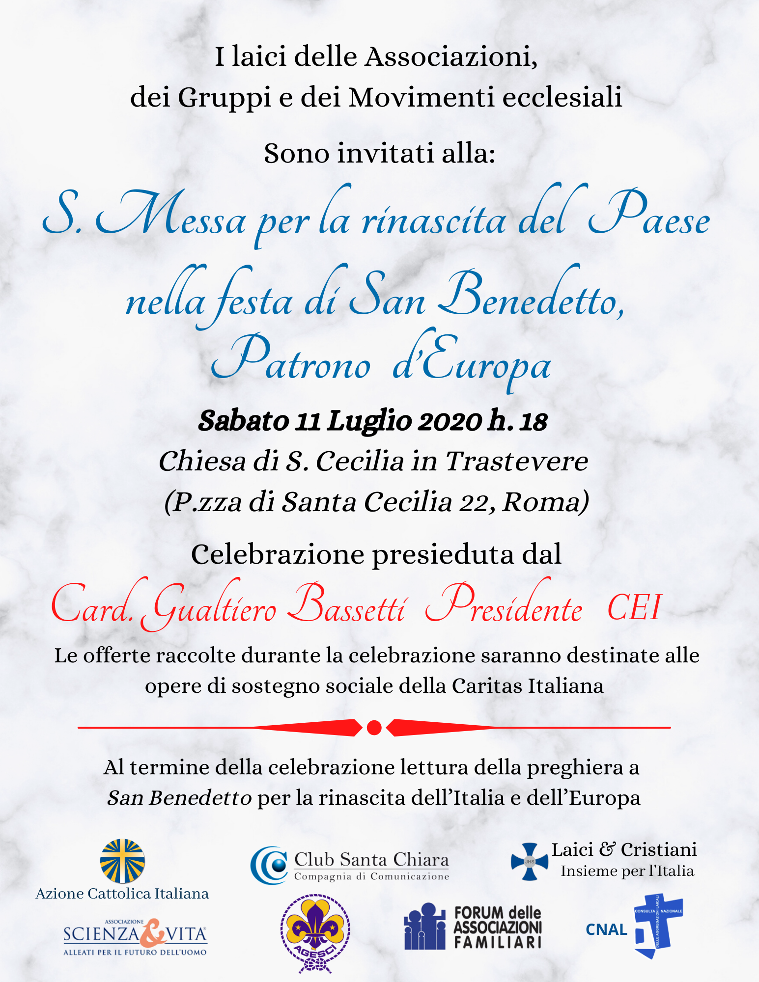 I laici delle Associazioni, dei Gruppi e dei Movimenti ecclesiali, sono inviatati alla S. Messa per la rinascita del Paese, nella festa di San Benedetto Patrono d’Europa.