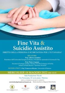Il 18 maggio 2022, a Palermo, si svolgerà un convegno sul tema “Fine vita & suicidio assistito. Diritto della persona o scorciatoia per l’eutanasia”, promosso dai Circoli culturali Giovanni Paolo II.