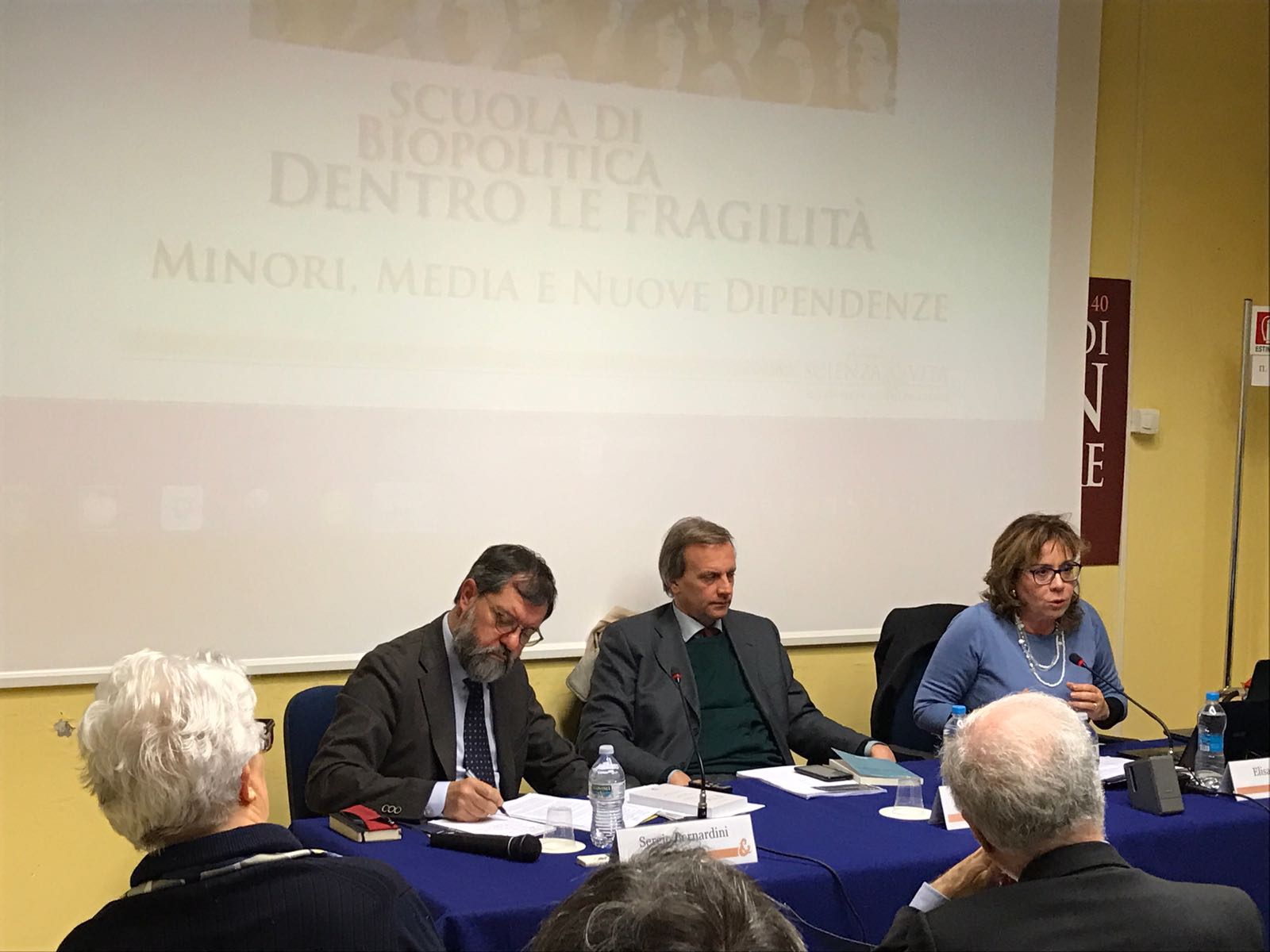 Modera:  Sergio Bernardini, Direttore U.O.C. Laboratorio di Biochimica Clinica e Centro Prelievi Univ. Tor Vergata Roma | Introduzione alla Scuola di Biopolitica (video) Alberto Gambino, Presidente nazionale Associazione S&V e prorettore Univ. Europea di Roma | Media e Minori  Elisa Manna, Consiglio Nazionale degli Utenti AGCOM | I Minori e le nuove dipendenze  Alberto Siracusano, Direttore U.O.C. Psichiatria e Psicologia Clinica, Usv-rm_-dentro-la-fragilita_minori-media-e-nuove-dipendenzeniv. Tor Vergata Roma  | Mobile born a scuola: dalla mente tecnoliquida al cyberbullismo Tonino Cantelmi, medico psichiatra, psicoterapeuta e presidente dell’Istituto di Terapia Cognitivo-Interpersonale | Ruolo e Responsabilità della Politica Paola Binetti, parlamentare, medico psichiatra e psicoterapeuta.