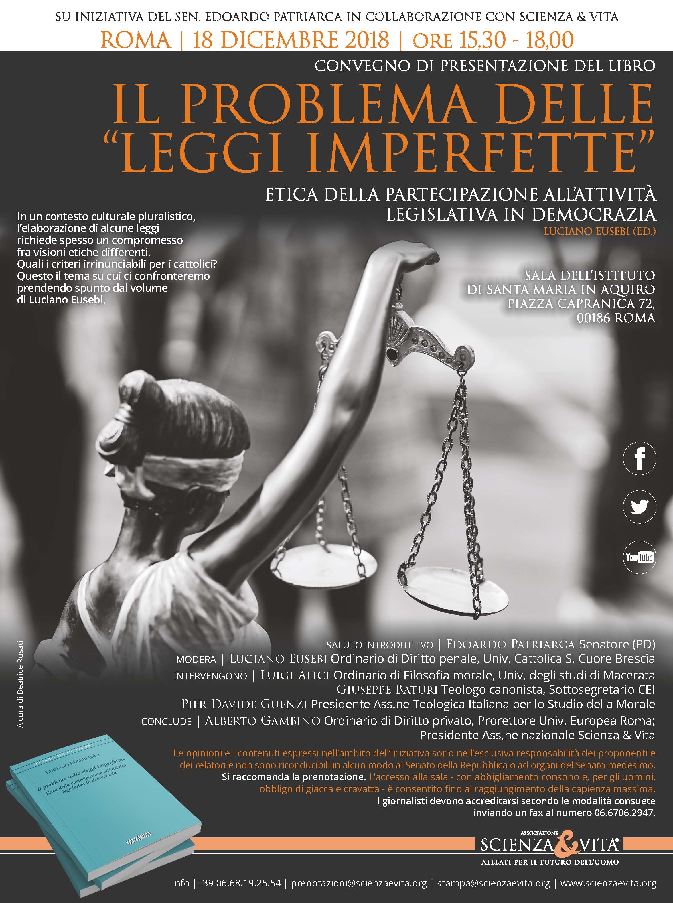 Su iniziativa del Sen. Edoardo Patriarca in collaborazione con l’Associazione Scienza & Vita 18 dicembre 2018 (15.30 – 18.30), si è svolto a Roma un convegno di presentazione del libro Il problema delle leggi imperfette. Etica della partecipazione all’attività legislativa in democrazia (ed. Luciano Eusebi). Vai al programma
