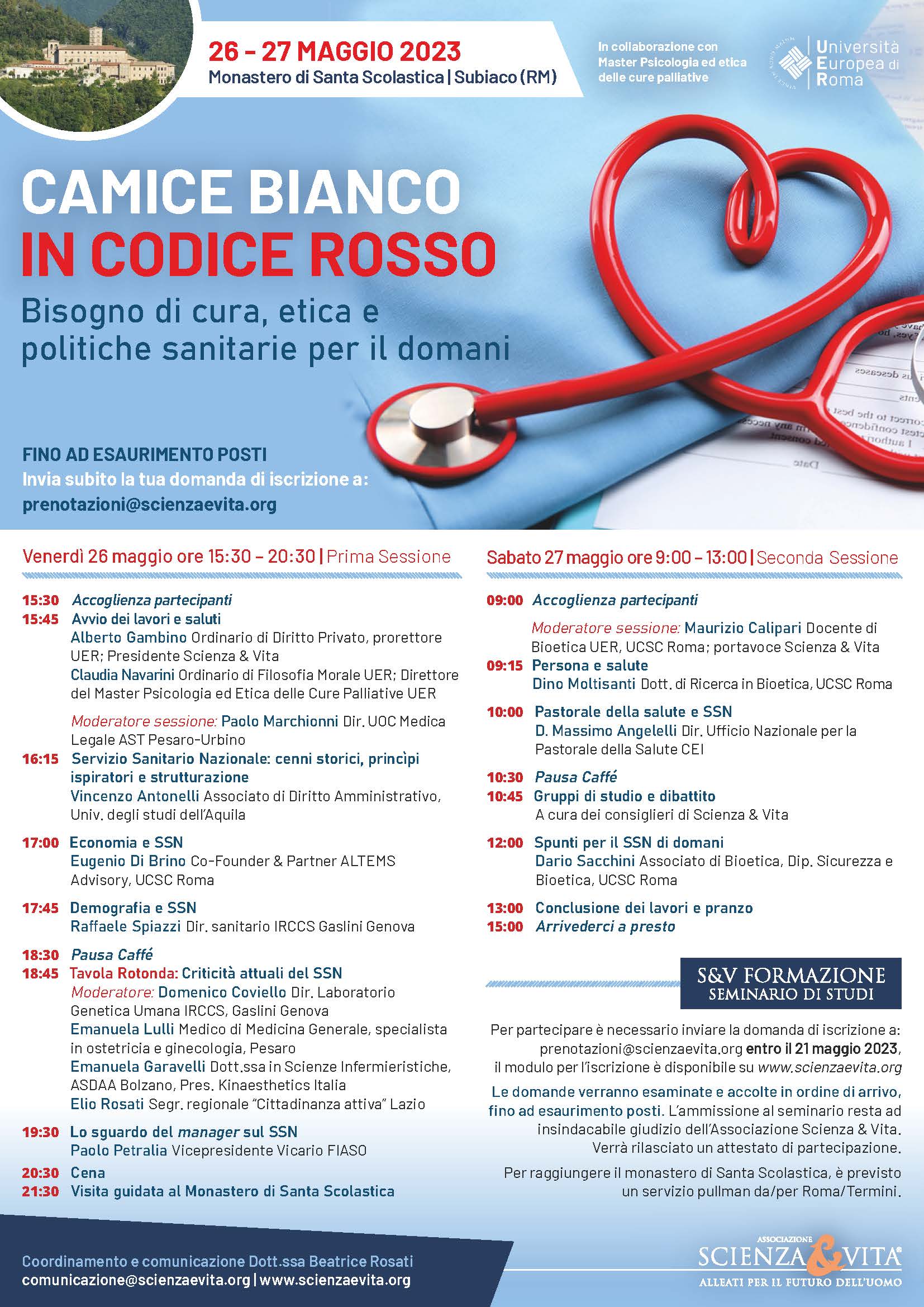 Ne parleremo a Subiaco, nel seminario di Studi di Scienza & Vita: CAMICE BIANCO IN CODICE ROSSO. BISOGNO DI CURA, ETICA E POLITICHE SANITARIE PER IL DOMANI, che si inserisce all’interno del Master Universitario in Psicologia ed Etica delle Cure Palliative, organizzato dall’Università Europea di Roma in collaborazione con Scienza & Vita.