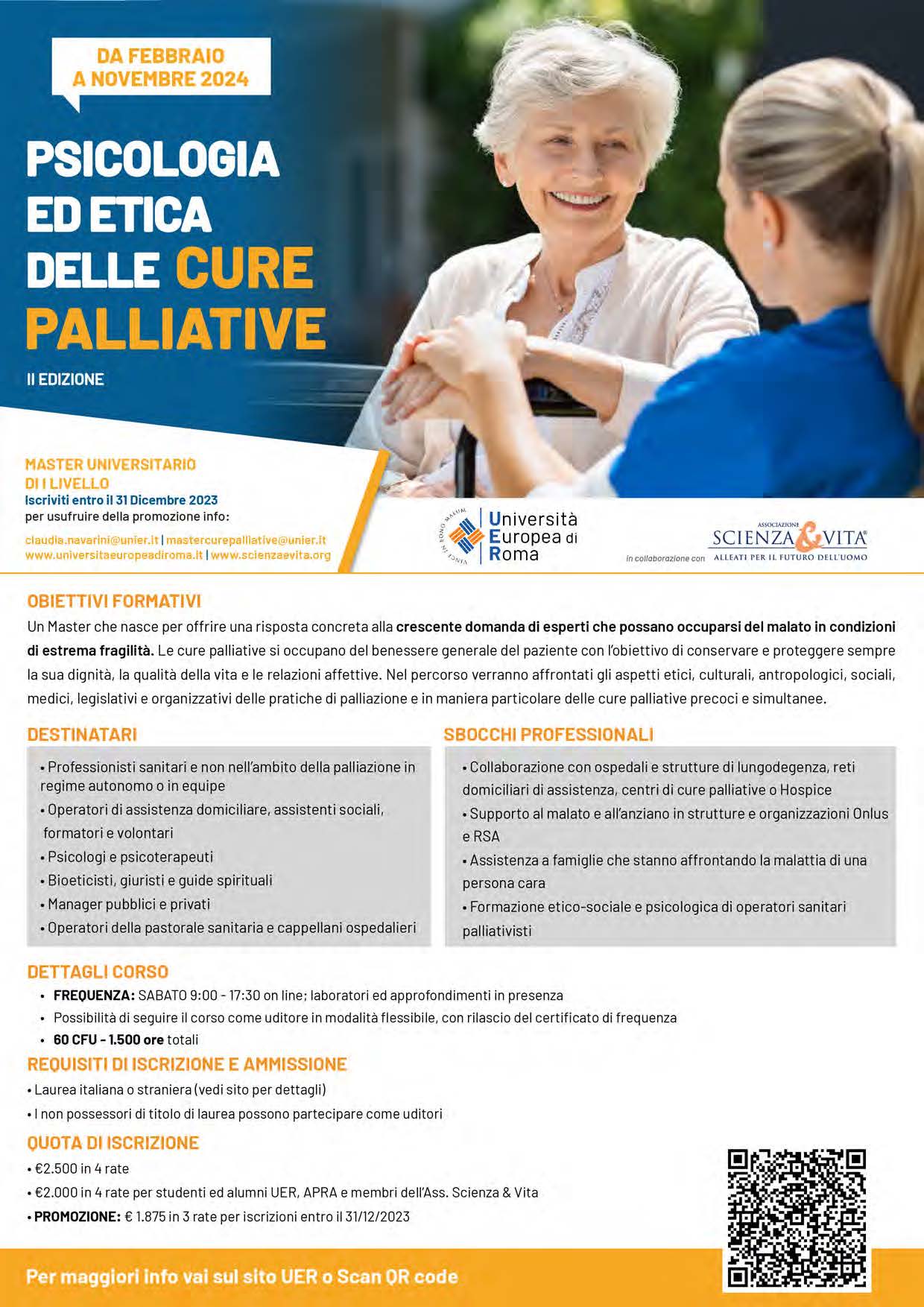Il Master non rientra nei percorsi di formazione e qualificazione in “Terapia del dolore e cure palliative” previsti dai DM 4 aprile 2012, rivolti ai medici specialisti e ai professionisti sanitari, ma offre una conoscenza generale delle cure palliative con particolare riguardo agli aspetti psicologici, etici e spirituali. Pertanto, i medici e i professionisti sanitari dovranno sostenere un colloquio di pre-ammissione, al fine di verificare le motivazioni e la compatibilità fra le esigenze della loro professione e gli obiettivi del Master, inviando il loro cv all’indirizzo: mastercurepalliative@unier.it